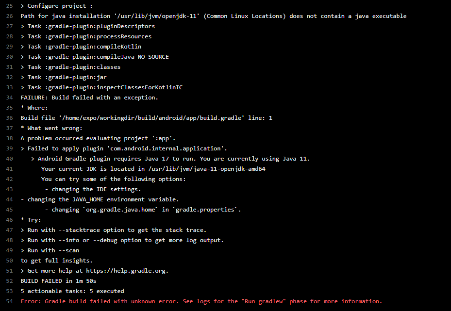 eas.json 에 android의 image를 'default' 로 지정을 해뒀는데 해당 이미지에서 java11 버전을 사용했기 때문에 오류가 남.