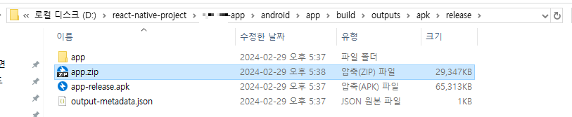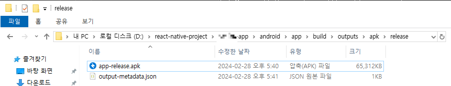 android/app/build/outputs/apk/release 하위에 .apk 파일이 생성됨