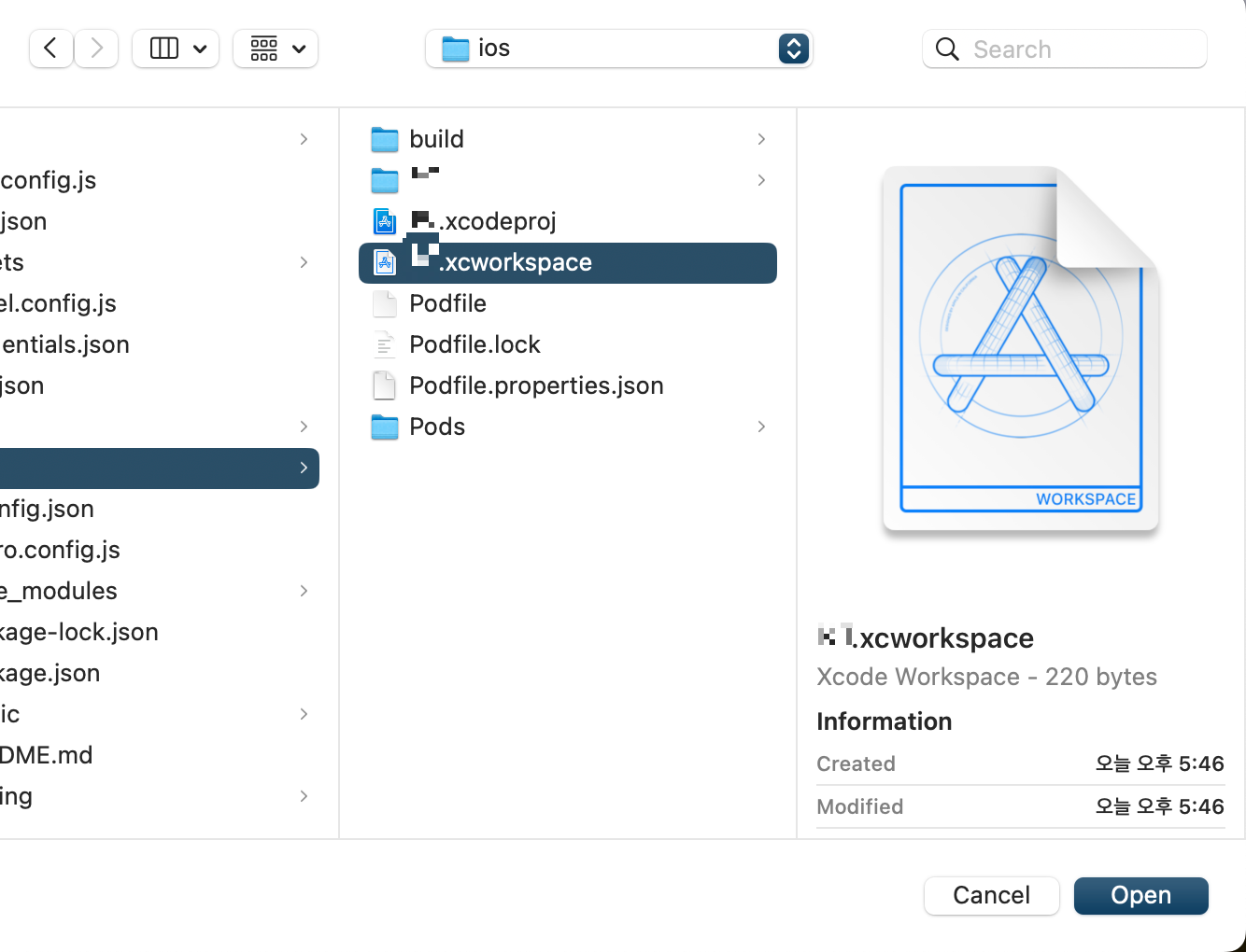 prebuild 후 생성된 /ios/프로젝트명.xcworkspace 열기
